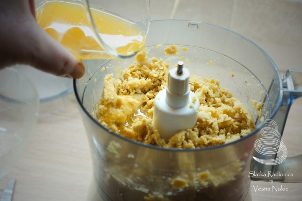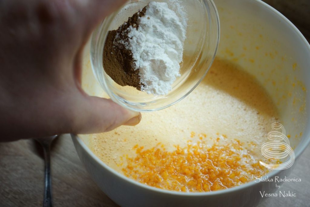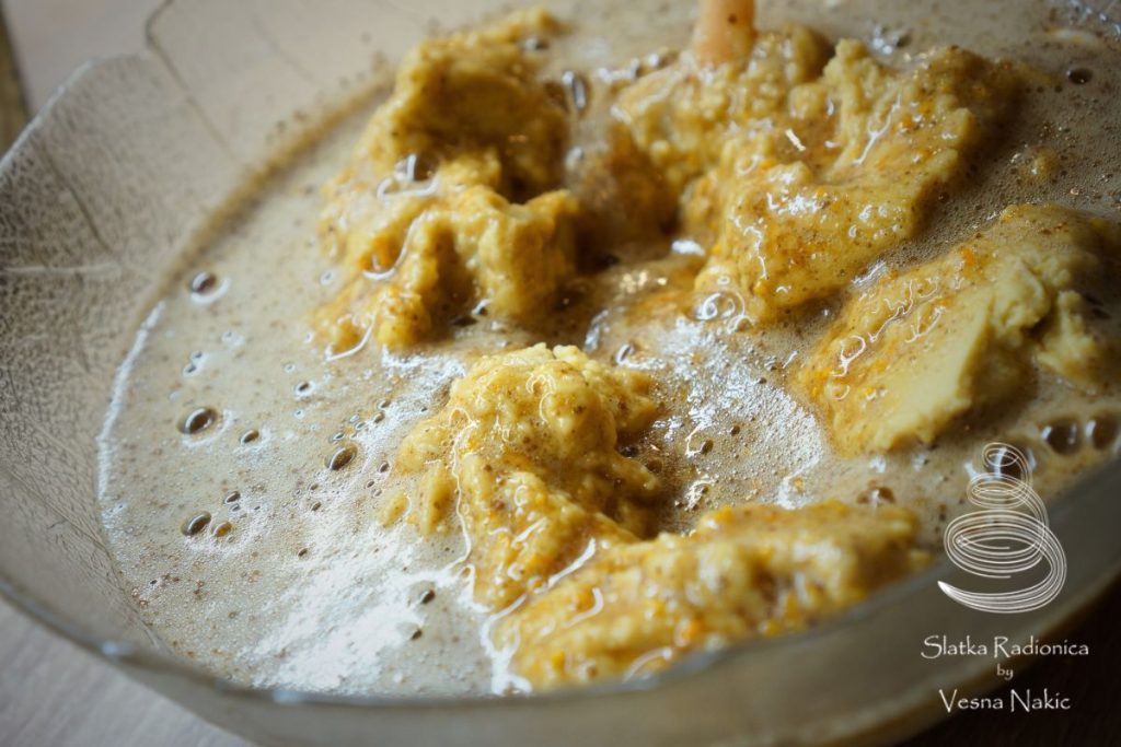 Cijela jaja pomiješati sa šećerima, dodati im koricu naranče te prašak za pecivo i cimet. Promiješati i sve dodati u pire od slanutka. Vilicom lagano miješati dok se ne sjedini u jednoličnu masu.