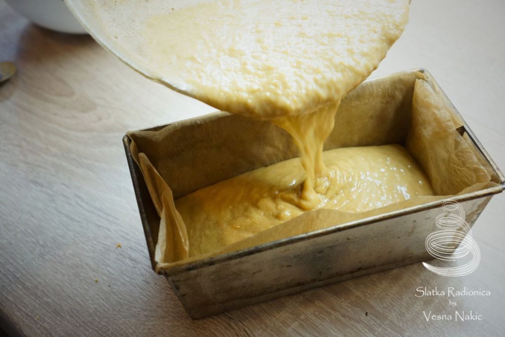 Kalup za pečenje obložiti papirom za pečenje. U njega izliti žitku masu i staviti u zagrijanu pećnicu na 1h15′ – 1h30′ – ovisno o pećnici. Ubodite čačkalicu, bitno je da izađe suha.