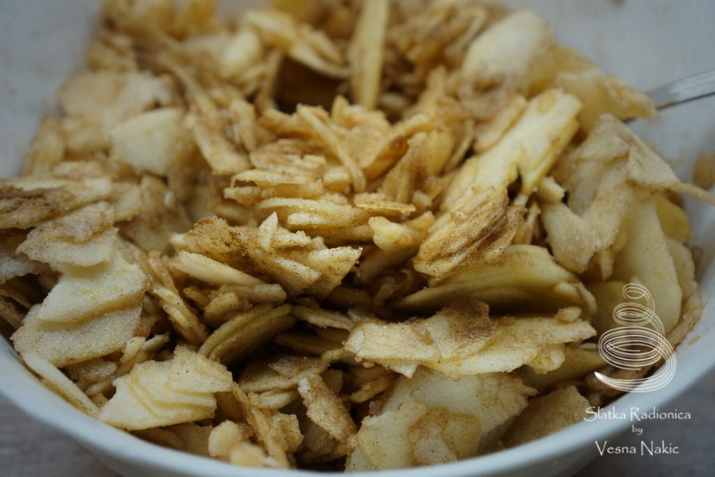 Za nadjev od jabuka: jabuke očistiti, narezati na četvrtine i svaku četvrtinu na šnitice. Dodati šećer, cimet i grožđice. Dobro promiješati i ostaviti da odstoji.