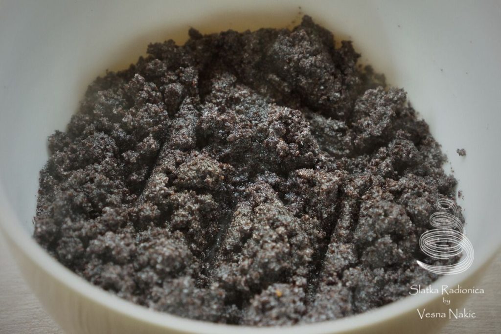 • Nadjev od maka rasporedite, ili možda bolje reći „razbacajte“ u male hrpice po kori, da ga bude lakše razmazati i da ne „upada“ u sir ispod njega