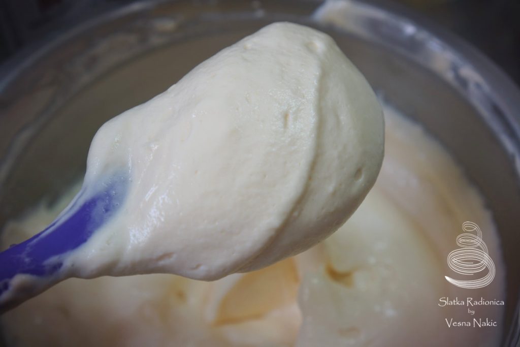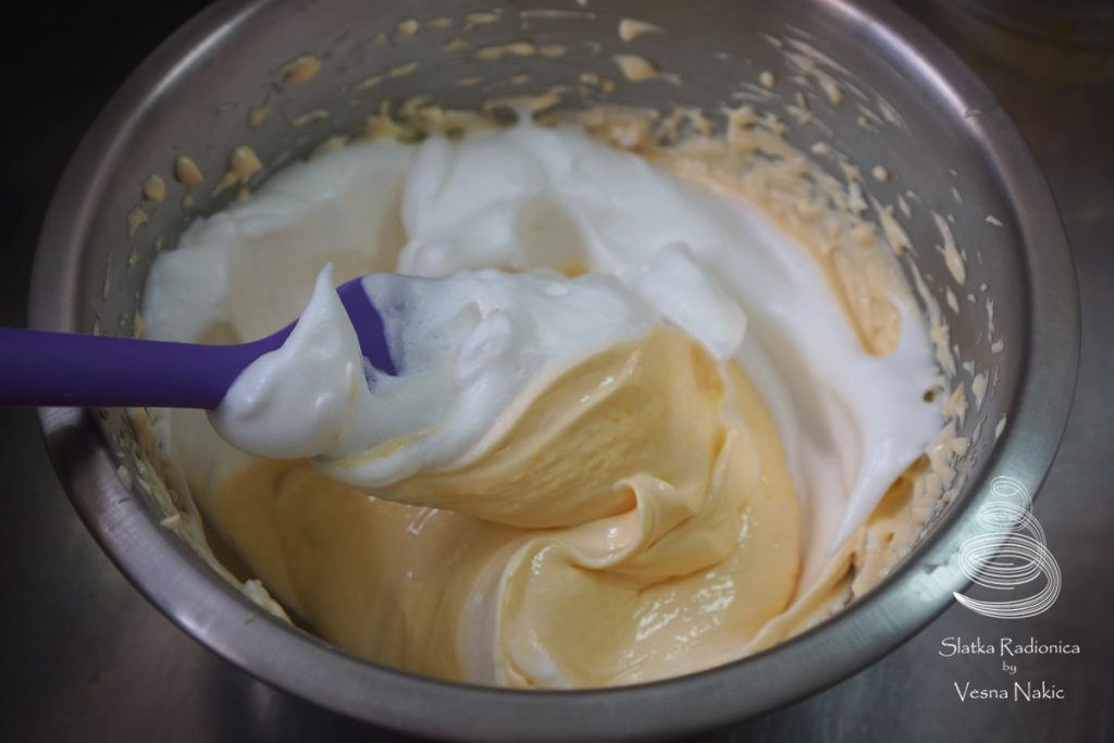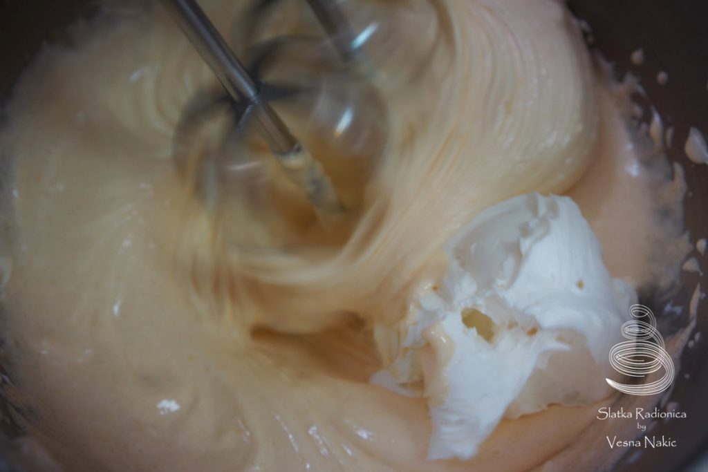 Mascarpone krema: U jednoj zdjeli pomiješati žumanjke i pola šećera. Miksati dok smjesa ne postane svijetla i pjenasta te dok se šećer ne otopi. Smanjiti mikser na najmanju brzinu i u 2-3 navrata dodati mascarpone sir. Nastaviti miksati na srednjoj brzini dok se ne dobije jednolična krema. U drugoj zdjeli bjelanjke sa drugim dijelom šećera istući u čvrsti snijeg te ih špatulom lagano umiješati, da krema ostane prozračna. Kremu ostaviti na stranu.