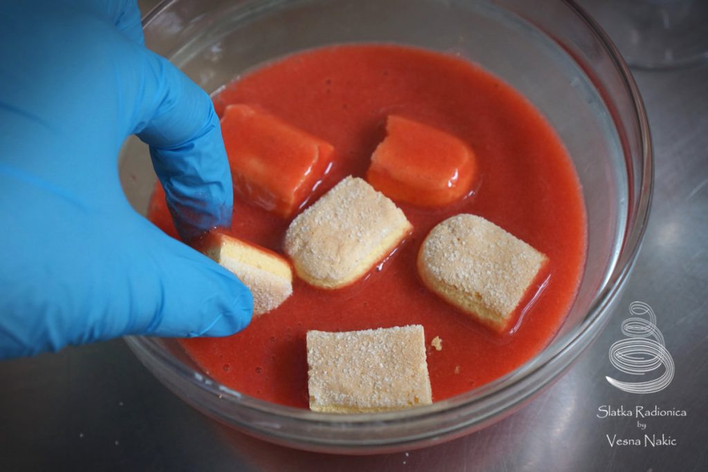 Piškote razlomiti na 2-3 komada i staviti ih u coulis. Neka stoje cca 5 minuta sa svake strane.