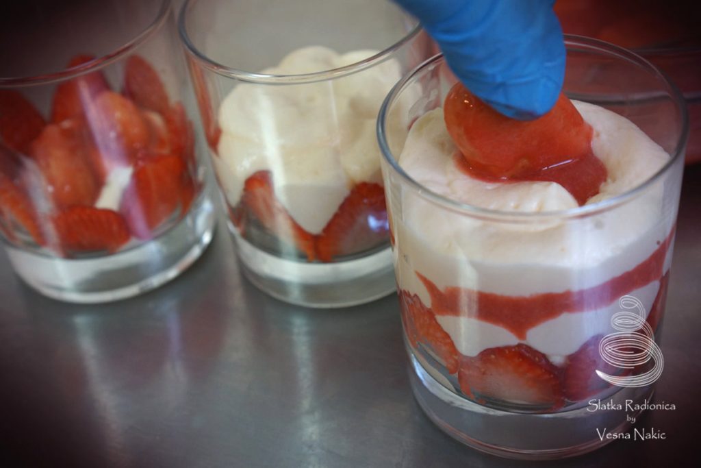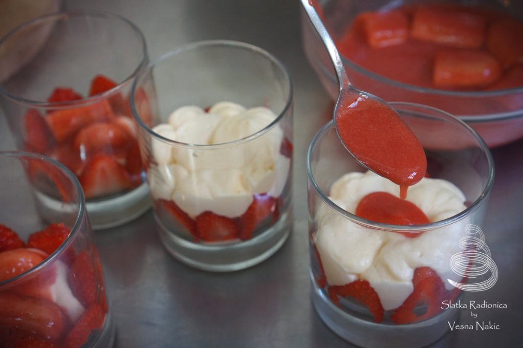 Jagode oprati, očistiti i narezati te po želji slagati u čaše, izmjenjujući jagode, kremu, piškote i coulis. Gotove čaše dekorirati po želji i staviti na hlađenje na bar 3-4 sata prije posluživanja.