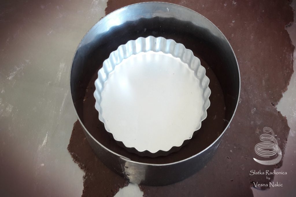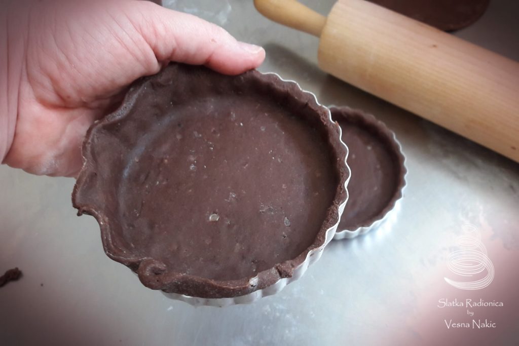 Čokoladno slatko tijesto: Maslac sobne temperature, prosijani šećer u prahu, bademe (ne smeta ako su i grublje mljeveni), sol i vaniliju staviti u jednu zdjelu i početi miksati na najnižoj brzini. Kad se poveže malo pojačati brzinu i par minuta miksati dok sjesa ne postane kremasta i prozračna. Dodati jaje, nastaviti miksati u jednoličnu cjelinu. Brašno i kakao prosijati direktno u zdjelu i nastaviti miksati dok tijesto ne postane glatko i ujednačeno. Istresti tijesto na lagano pobrašnjenu podlogu, formirati kuglu, spljoštiti je u oblik diska, zamotati u kuhinjsku plastičnu foliju te staviti u frižider na 2-3 sata.
