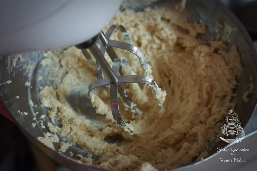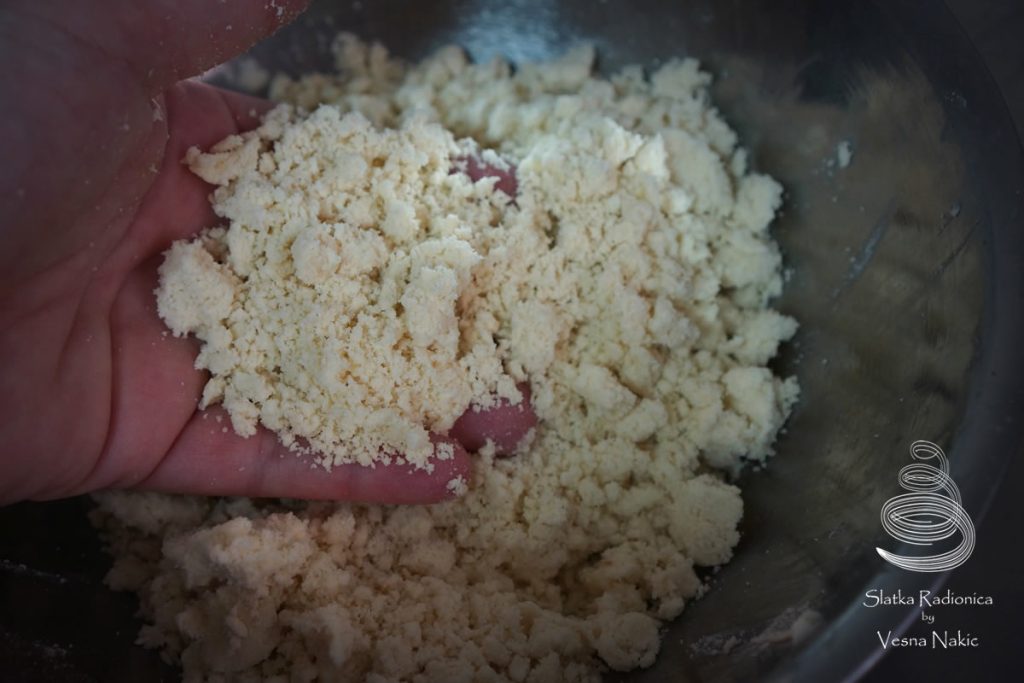 Tijesto: brašno i maslac (neka bude hladan i izrezan na manje komadiće) prstima spojite ili ubacite u multipraktik i vrtite na opciju pulsiranja do faze mrvica. Dodati ostale sastojke i sve povezati u glatko mekano tijesto. Tijesto zamotati u plastičnu foliju i ostaviti u frižider min. 1h.
