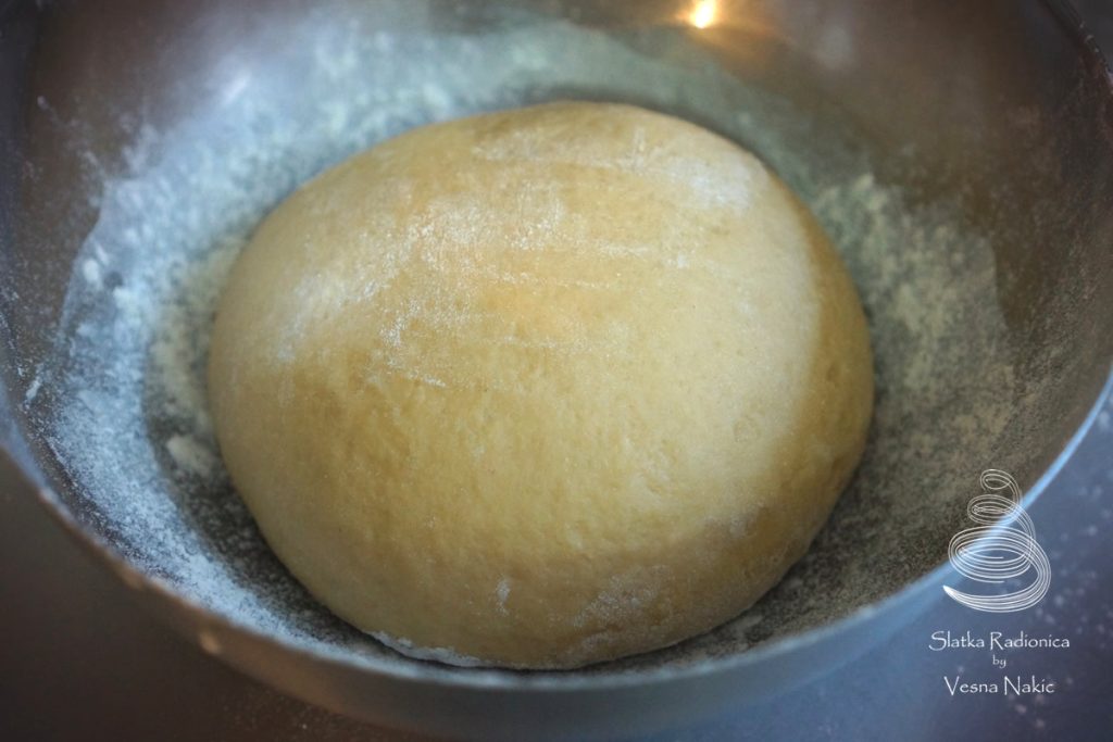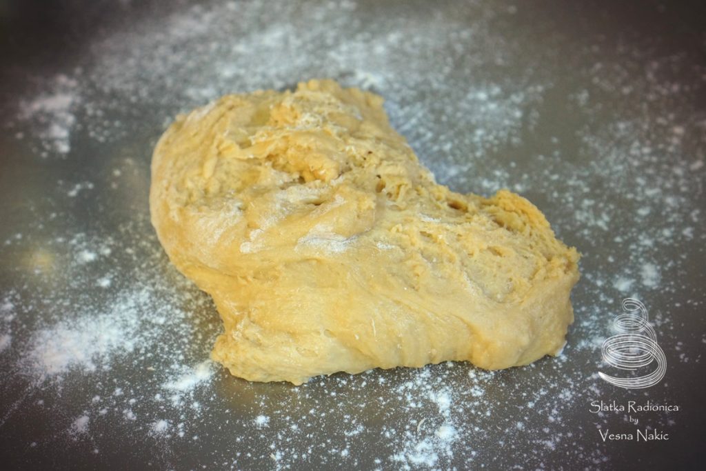 Mlako mlijeko (cca 37°C) preliti preko izdrobljenog kvasca sa žlicom šećera. Promiješati, posuti po vrhu malo brašna i ostaviti da se kvasac digne. Brašno prosijati, dodati „probuđeni“ kvasac, žumanjke, šećer i sol te miksati na maloj brzini, 10-15 minuta, dok se ne formira glatko tijesto. Premijesiti ga na malo brašna, formirati glatku kuglu, staviti je u lagano pobrašnjenu zdjelu, pokriti vlažnom krpom i ostaviti dok ne naraste za duplo. Po prilici nekih 45 minuta.