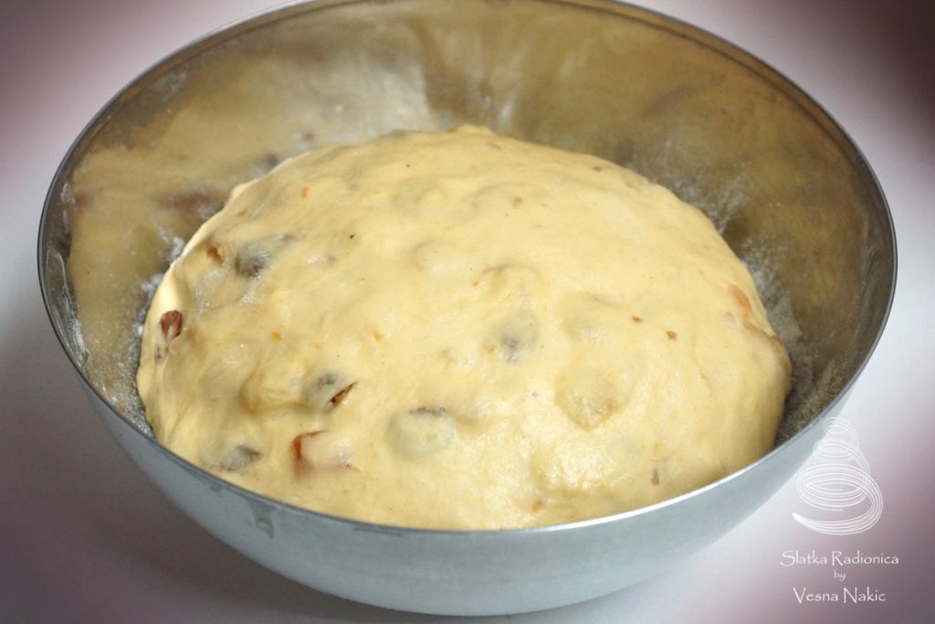Procijediti marinirano voće. Tijesto lagano rukom „ispuhati“, vratiti u mikser. Dodati voće i omekšali maslac te opet na niskoj brzini miksati 10-15 minuta, dok se ne formira glatko tijesto. Tijesto će sada biti mekše nego prvi put. Po potrebi dodati žlicu brašna za premijesiti ga i staviti u istu zdjelu posutu brašnom za drugo dizanje. Opet zdjelu pokriti vlažnom krpom i ostaviti na sobnoj temperaturi da fermentira dok se ne udvostruči. Po prilici 30-40 minuta.