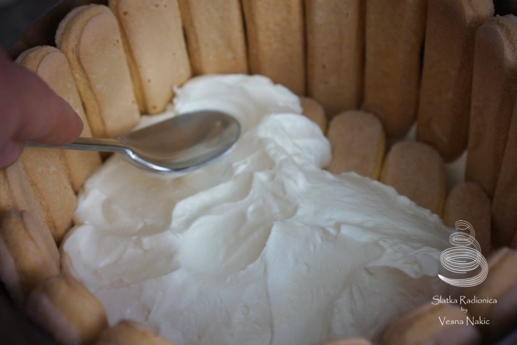 Slaganje: Piškotama odrezati vrhove tako da budu stabilni i da mogu samostalno stajati. Poslagati ih u krug uz rub kalupa te ih posložiti na dno.