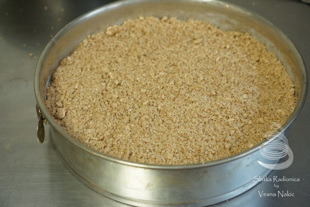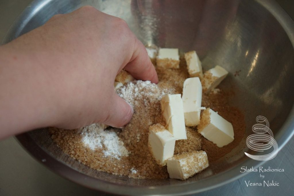 Crumble: U zdjeli pomiješati suhe sastojke. Dodati komadiće maslaca i vrhovima prstiju ih lagano umiješati dok se ne dobije smjesa nalik krušnim mrvicama. Ostaviti sa strane.