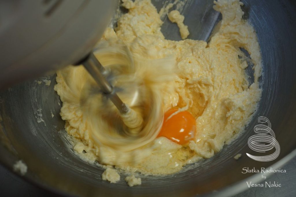 Tijesto: Omekšali maslac i šećere mutiti mikserom dok ne postanu prozračni. Dodavati jaja, jedno po jedno. Ujednačiti smjesu prije dodavanja slijedećeg. U drugoj zdjeli prosijati brašno i prašak za pecivo. Suhe sastojke u dva-tri navrata dodati u mokre, promiješati špatulom do ujednačene smjese.