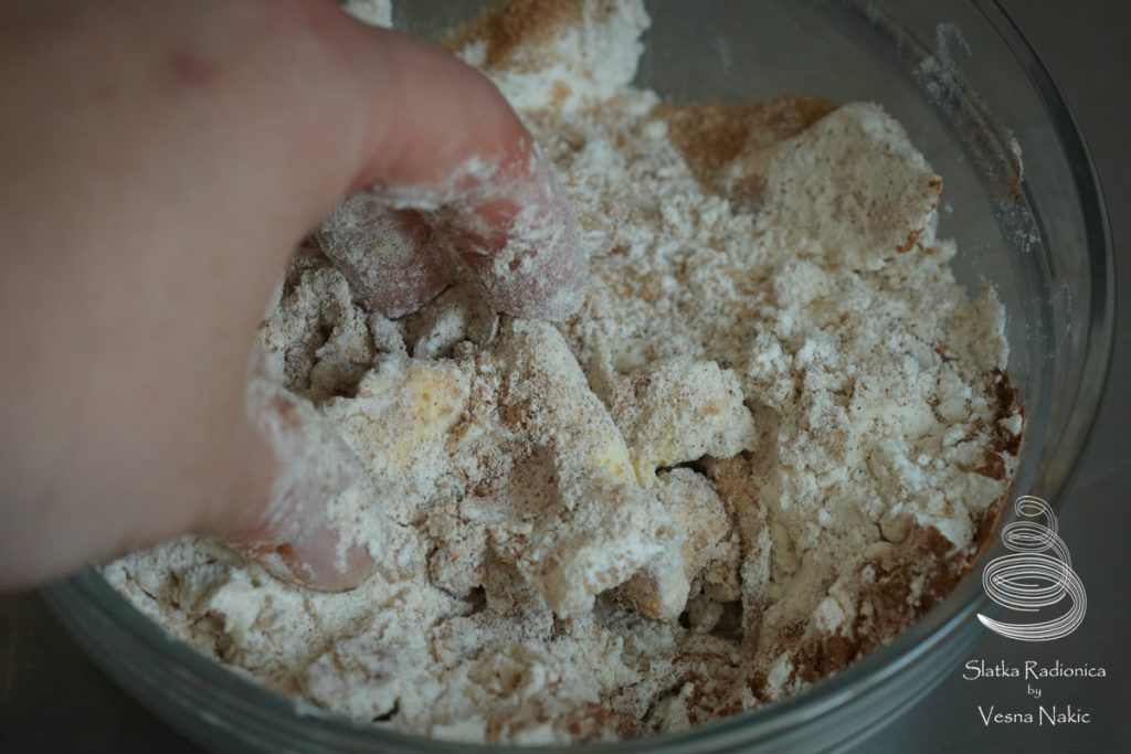 Mrvičasti posip: brašno, šećer, cimet i maslac staviti u zdjelu za miksanje. Lagano prstima umiješati maslac dok ne formira jedinstveno tijesto. Zamotati u kuhinjsku foliju i staviti u frižider na cca pola sata.