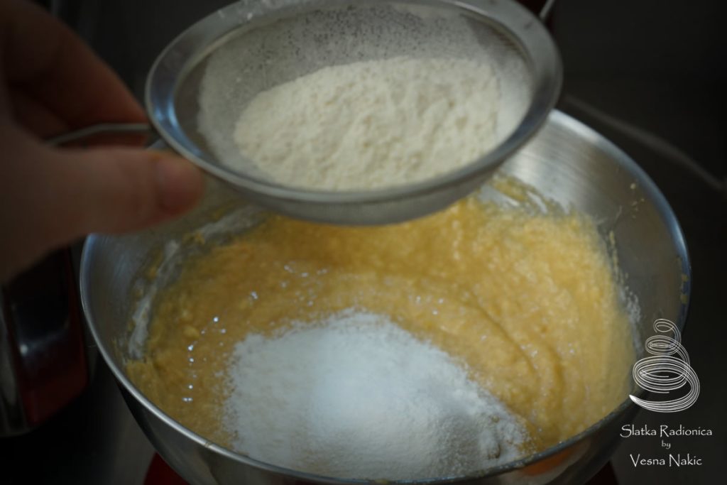 Jaja razlupati te ih malo po malo dodavati smjesi maslaca. Kako biste izbjegli stvaranje grudica, pri dodavanju jaja svaki put pričekati da se prethodno dodana količina absorbira. Prosijano brašno s praškom za pecivo postupno dodavati. Na kraju dodati mlijeko i rum te umiješati u jednoličnu masu.