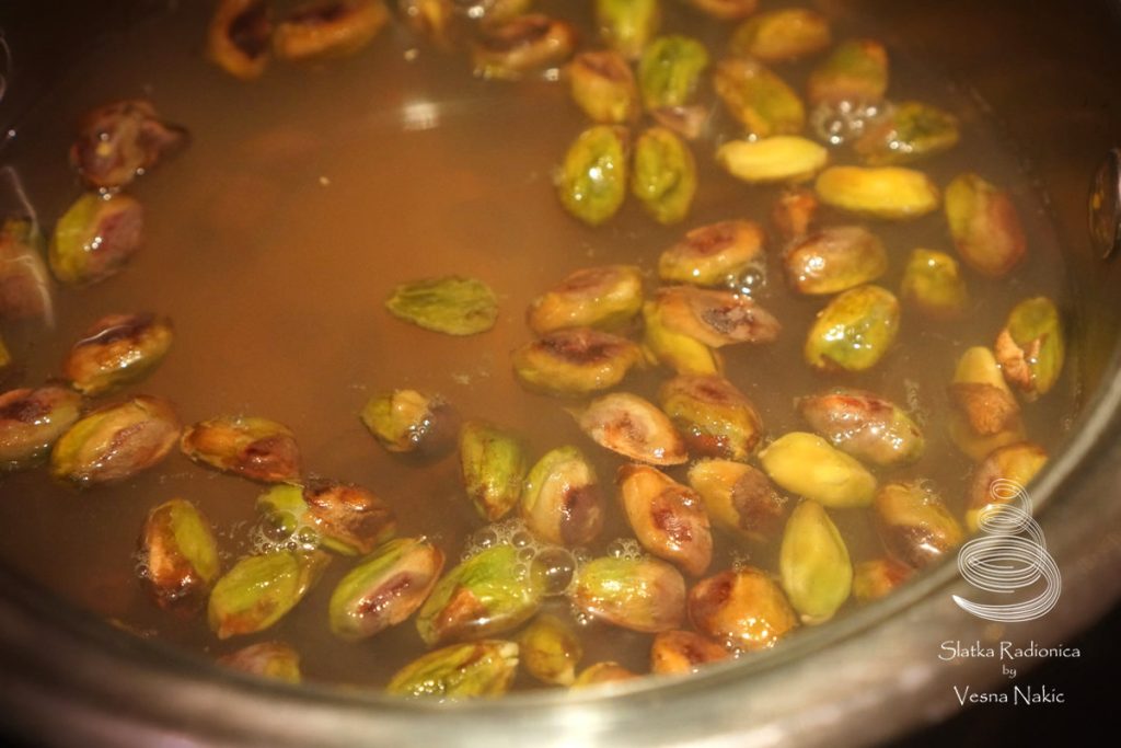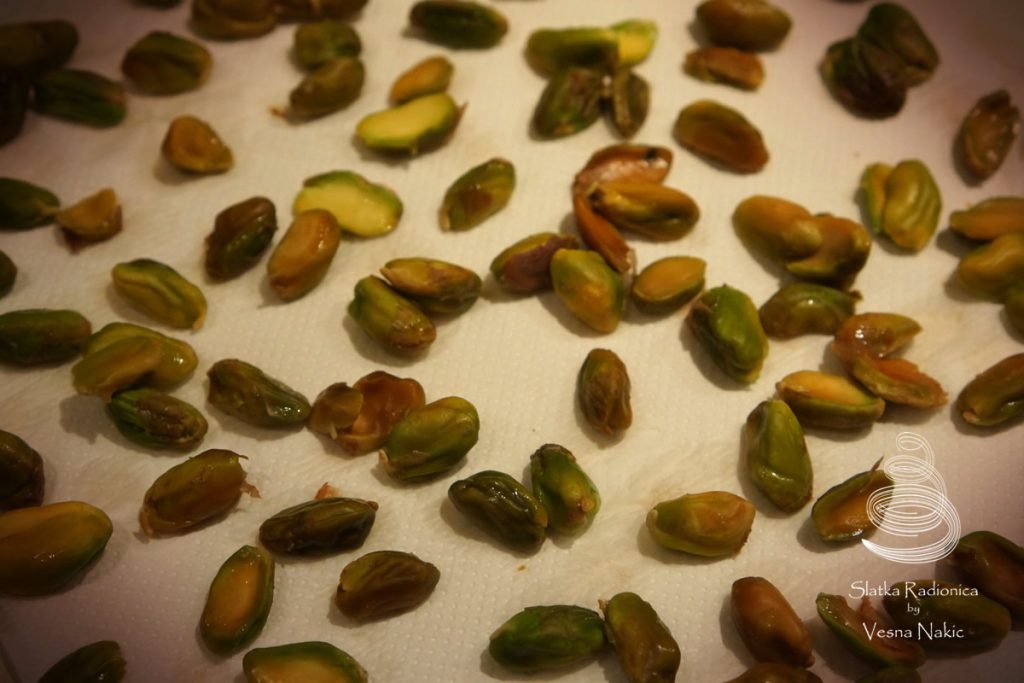 Pasta od pistacija: Do vrenja zagrijati vodu i u nju ubaciti pistacije očišćene od ljuske. Neka odstoji pet minuta. Procijediti ih i očistiti od kožice. Staviti na kuhinjski ubrus da se prosuše. Pistacije prebaciti u blender i isprekidano ih blendati 3-4 minute. Dodati ulje, nastaviti isprekidano blendati 2-3 minute. Potom dodati šećer u prahu i sol i opet blendati 2-3minute. Na kraju dodati vodu i finalno blendati dok se ne dobije gusta sjajna pasta.