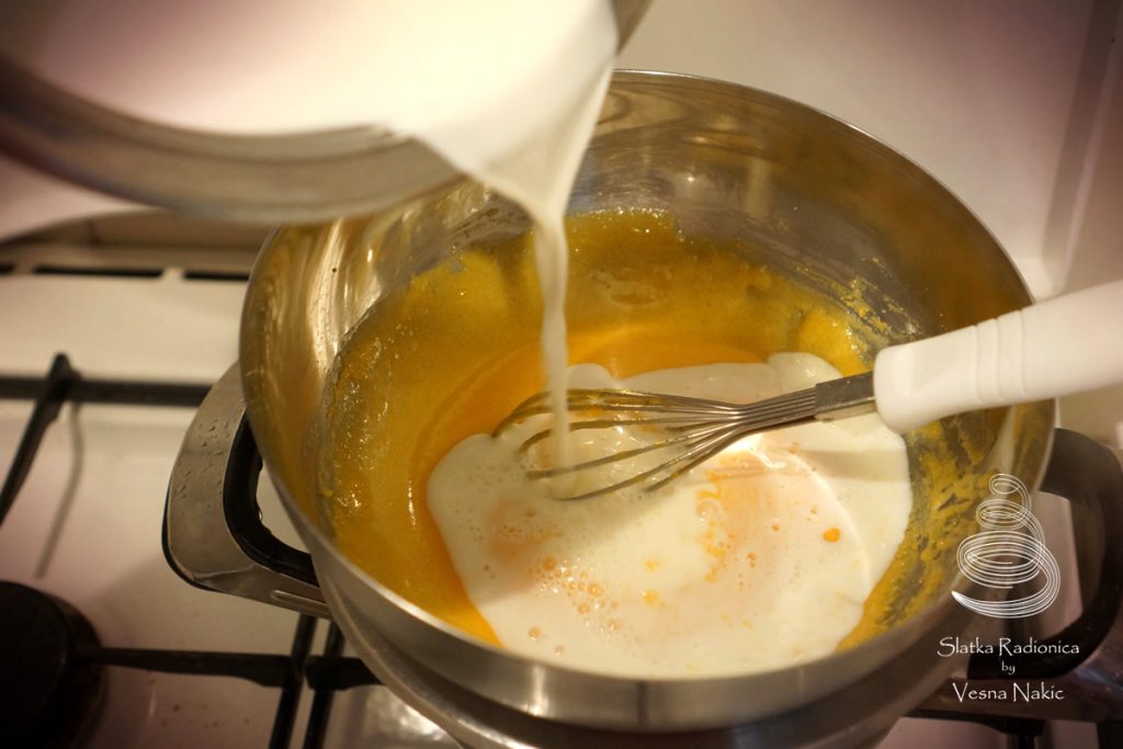 Krema: Žumanjke pomiješati s obje vrste šećera, staviti da se kuha na pari 15 minuta (dok se jaja ne počnu lagano zgušnjavati) povremeno miješajući. Želatinu razmutiti s 3-4 žličice hladne vode i ostavi da nabubri. Mlijeko zakuhati tako da bude spremno u isto vrijeme kada i žumanjci. Lagano ga uliti u smjesu od žumanjaka i pjenjačom ujednačiti smjesu. Kuhati na pari još 10-15 minuta povremeno miješajući i pazeći da jaja ne koaguliraju. Kremu maknuti sa štednjaka i u nju ubaciti nabubrenu želatinu. Sačekati nekoliko minuta da se otopi pa onda promiješati pjenjačom. Kremu podijeliti na dva jednaka dijela.