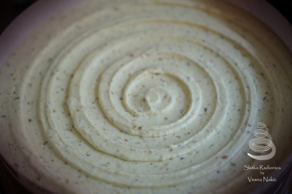 U drugi dio kreme dodati 100g paste od pistacija i pjenjačom ujednačiti. Drugi dio tučenog slatkog vrhnja špatulom dobro umiješati, dodati liker od pistacija i na kraju grubo sjeckane pistacije. Sve dobro sjediniti i premazati preko čokoladne kreme.